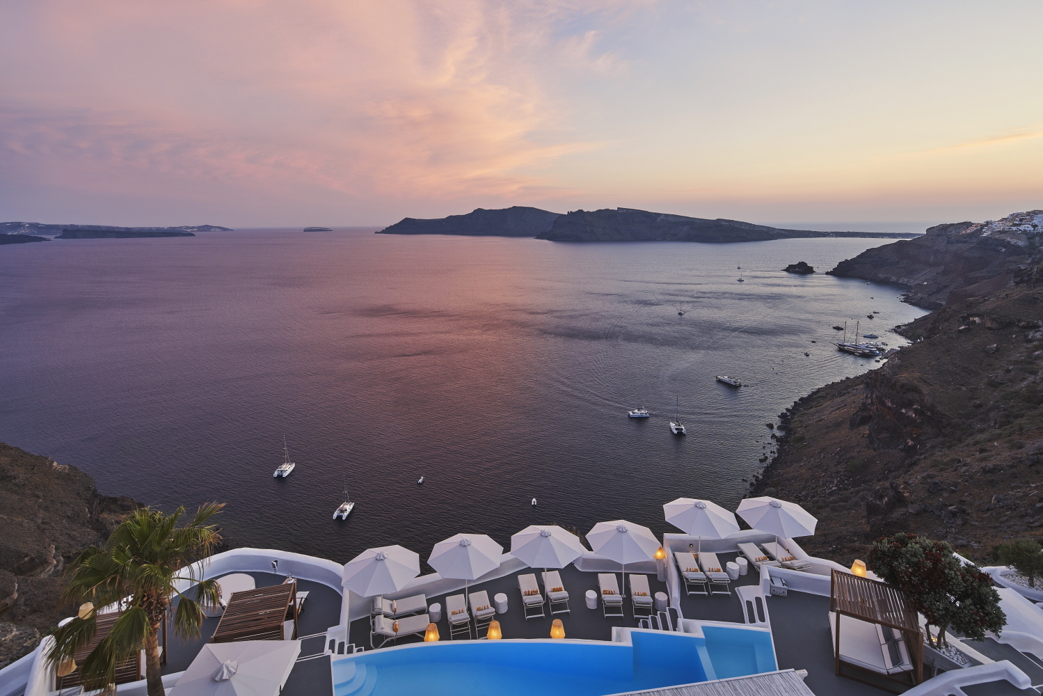 Located in Oia and considered one of the best places to stay on the island, the hotel has received several awards in recent years. It combines the architectural tradition of the Cyclades with the serene landscape of the Aegean Sea. There are 26 suites, an infinity pool, a Mediterranean restaurant, a spa, and a lounge. Here, guests will enjoy the excellent location, but can also enjoy privacy and exclusivity.